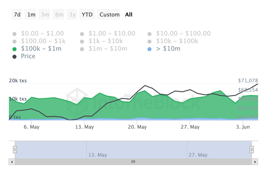オンチェーンデータは、過去30日間の毎日の大規模なトランザクションの数が大幅に増加していることを明らかにした。10万ドルから100万ドルのBTC取引は、この期間に9%急増した。