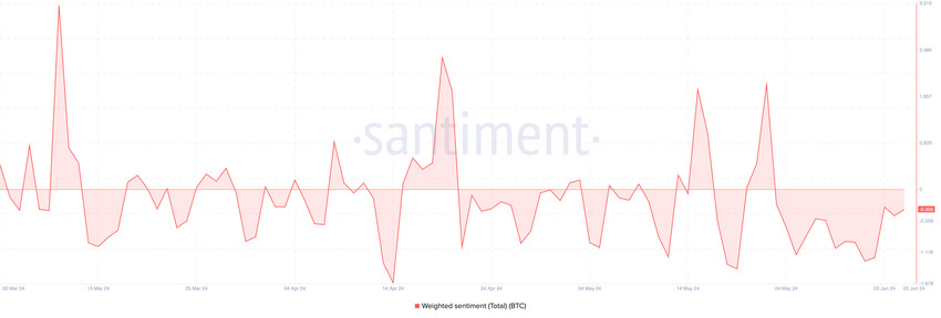 しかし、主要暗号資産を取り巻く一般的な市場センチメントは引き続きネガティブだ。オンチェーンデータは、BTCの最近の価格パフォーマンスにもかかわらず、その重み付けされたセンチメントは5月23日以来否定的であることを示した。