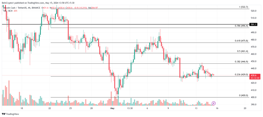 ビットコインキャッシュの価格は、430ドルに設定された重要な23.6%フィボナッチリトレースメントレベルを超えた。このレベルは弱気市場のサポートフロアとして機能しており、歴史的にテストされると回復をもたらすため、極めて重要である。