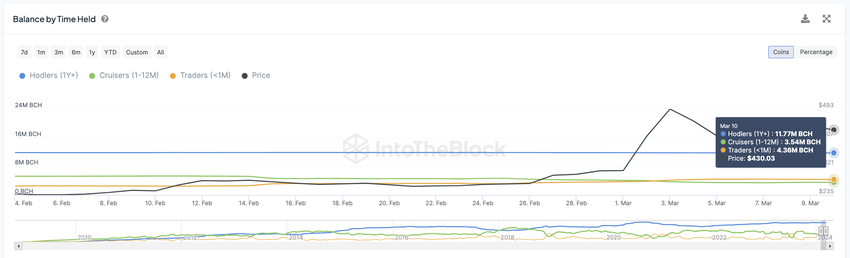 このシフトの大きさを過小評価することはできない。2月4日に入手したデータによると、トレーダーは253万BCHを保有していた。しかし、この数字は3月10日までに大幅に急増し、436万BCHに達した。この短期トレーダーによる保有量の急激な増加は、歴史的な前例を見直す必要がある。