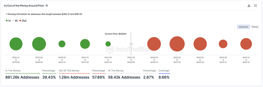 BCHのIn/Out of the Money Around Price (IOMAP)指標を分析すると、短期的な価格軌道に影響を与える可能性のある重要なサポートゾーンとレジスタンスゾーンが明らかになる。