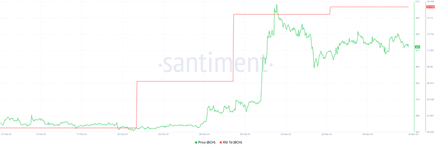 ビットコインキャッシュ(BCH)は、過去7日間で相対力指数(RSI)が大幅に上昇している。値動きの勢いを測定するために使用されるテクニカル分析指標であるRSIは、60から78.28まで上昇した。これにより、BCHは買われすぎの領域に入り、近い将来に売り圧力がかかる可能性を示唆している。