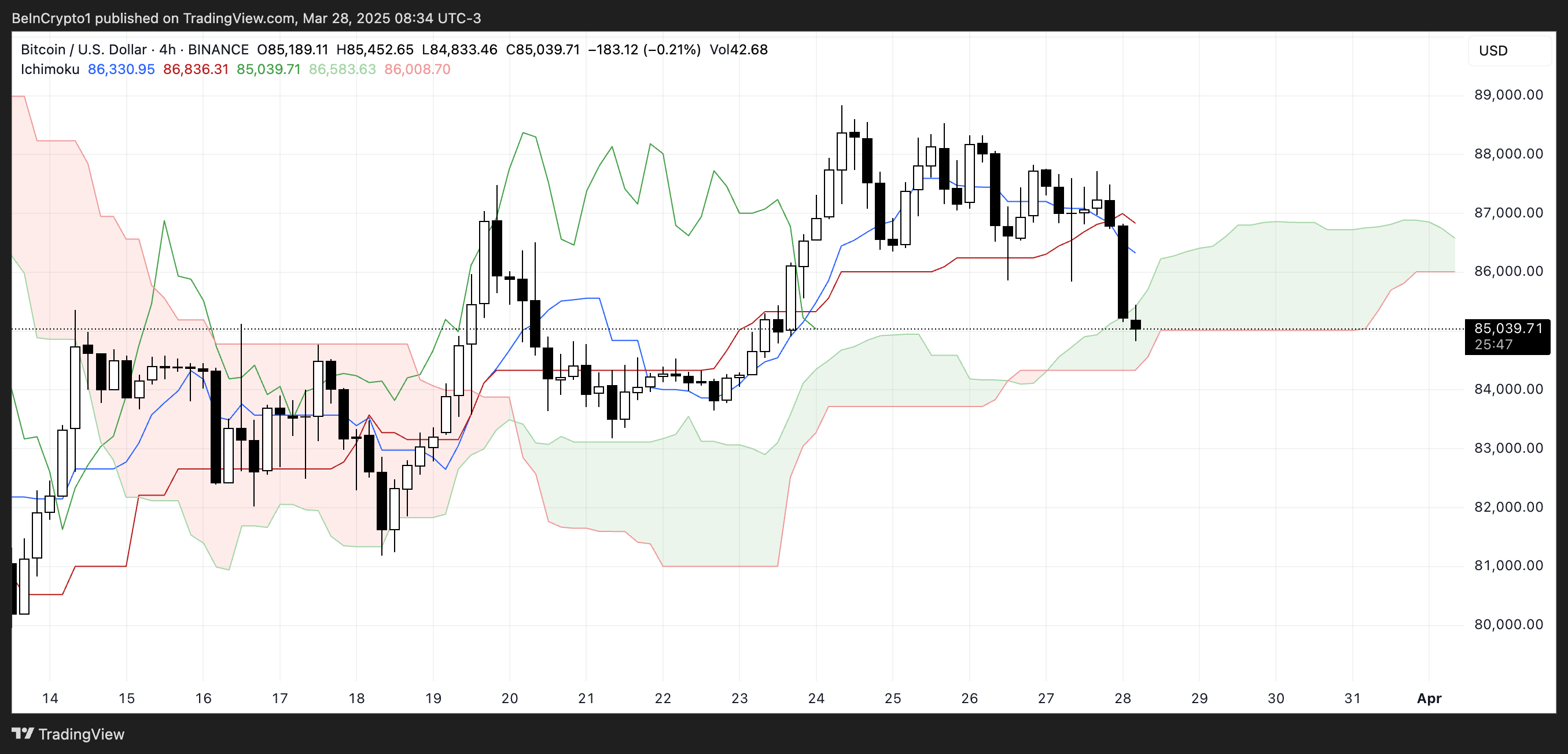 ビットコインの一目均衡表チャートは、短期的な弱気の変化を示している。価格動向は、テンカン線(青線)とキジュン線(赤線)を下回り、勢いの弱まりを示している。