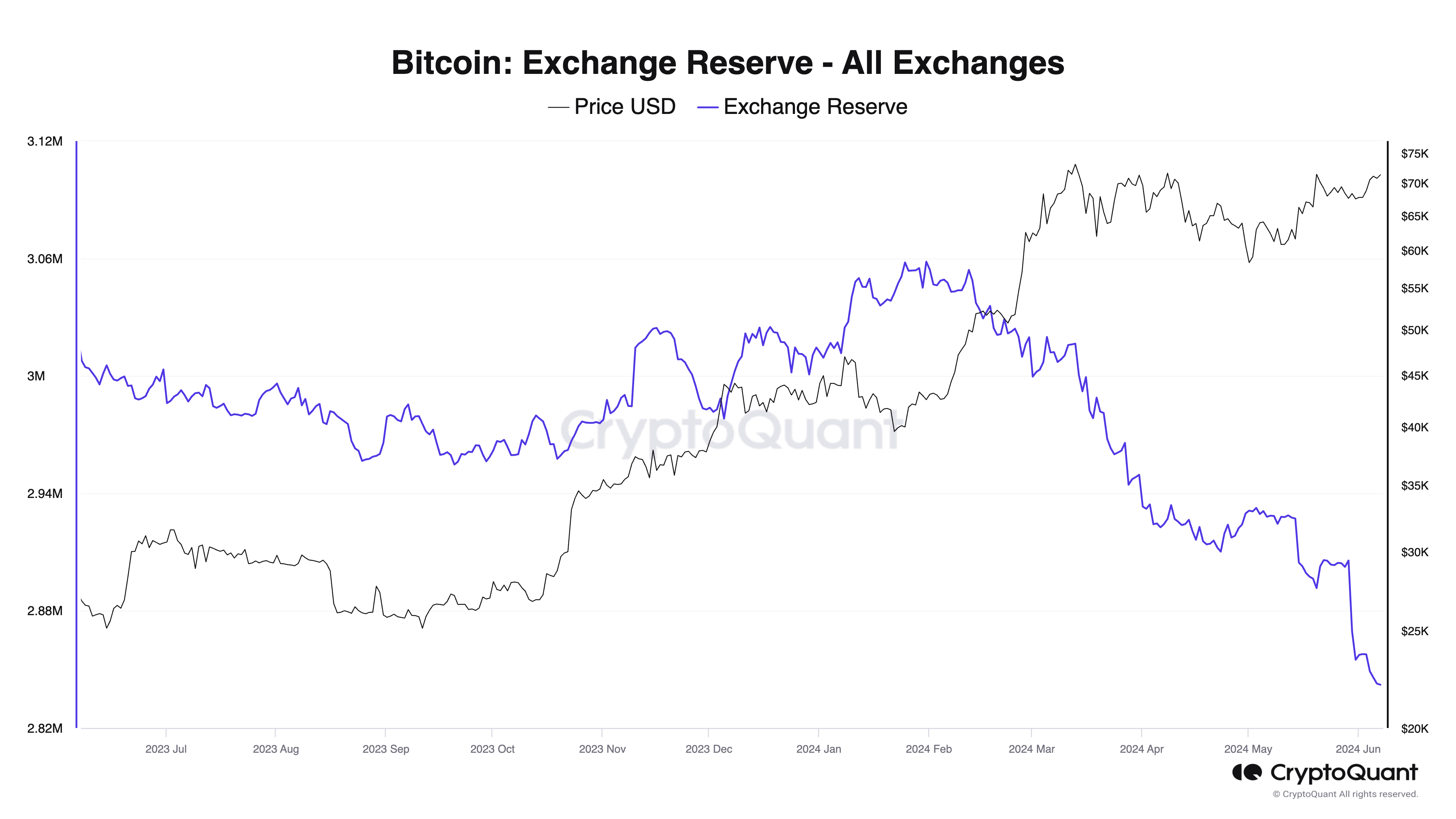 さらに、CryptoQuantのデータによると、暗号資産取引所におけるビットコインの供給量は1年ぶりの低水準にある。