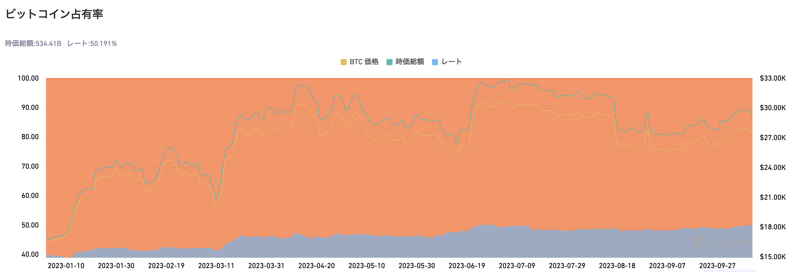 暗号資産(仮想通貨)データ分析企業CoinGlassによると11日、ビットコイン・ドミナンス(ビットコインの市場占有率)が約3カ月ぶりに50%を超えた。同指標は現在50.19%を記録し、年初時点の40.13%から約10%増加した。