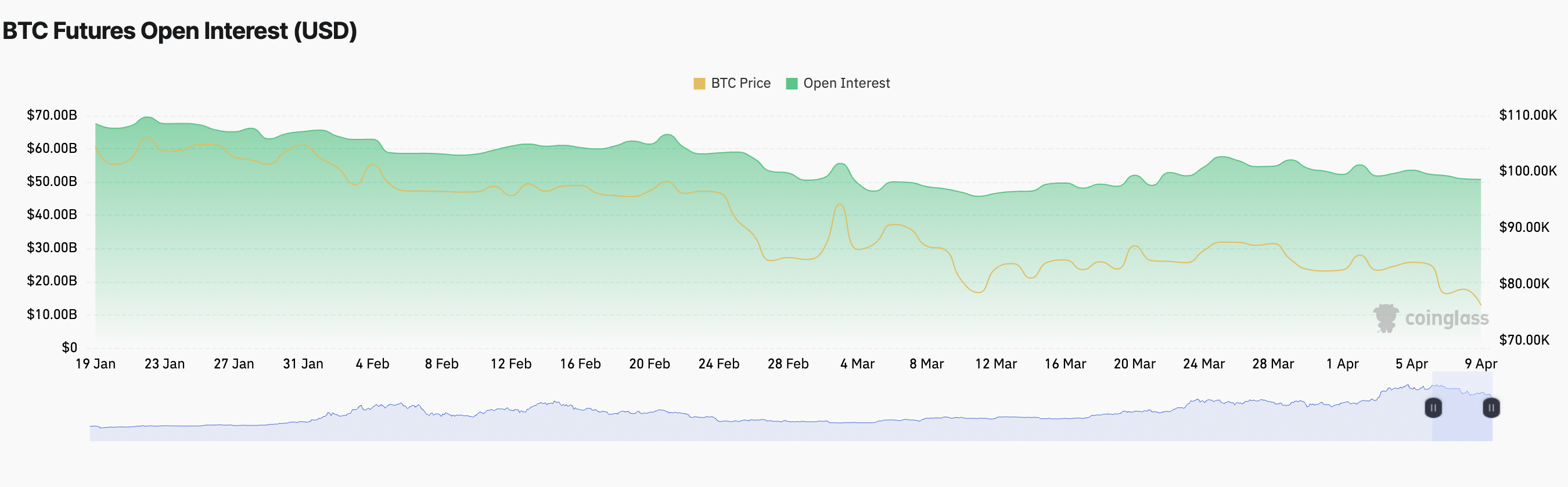 BTCのOIが減少すると、既存の先物契約が新しいものが開かれるよりも早くクローズまたは清算されていることを示している。これは、トレーダーの参加が減少しているか、現在の市場トレンドに対する確信が薄れていることを示している。
