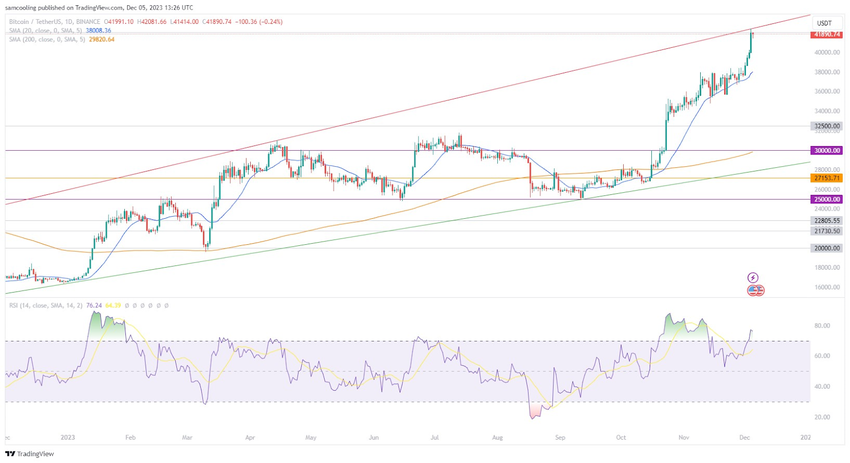Spot Bitcoin ETFのニュースに対する強気なマーケットセンチメント(市場心理)は、Bitcoinを4万ドル以上に押し上げ、2023年12月4日には4万2,288ドルまで上昇しました。