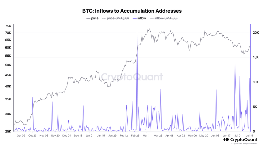 同時に、暗号資産クジラも活発に活動し、多額のBTCを蓄積している。7月15日、CryptoQuantのデータは、Bitcoin蓄積アドレスが約10,800 BTC、およそ6億5,664万ドルを受け取ったことを示した。