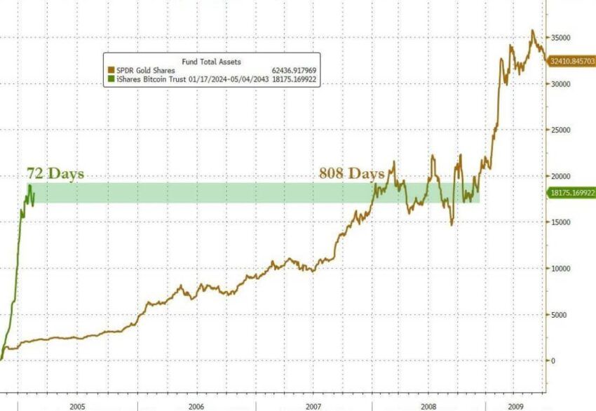 しかし、暗号資産YouTuberのAltcoin DailyによるX(旧Twitter)への投稿によると、BlackRock Bitcoin ETFは、金のETFが800日以上かかった運用資産(AUM)を70日で達成した。同氏は、ETF領域における金の初期と比較して、ビットコインに対する前例のない需要を強調した。