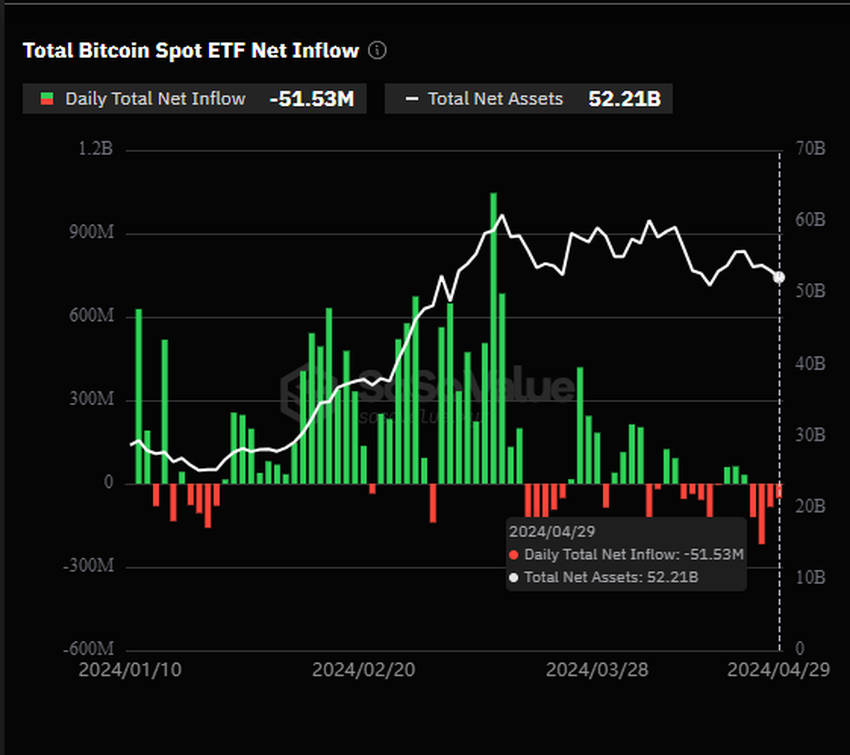 さらに、SoSo Valueのデータによると、米国のスポットビットコインETFは2024年4月29日現在、1日あたり5,153万ドルの資金流出を記録している。これで4日連続のマイナスフローとなった。以前はトップパフォーマーだったブラックロックのiシェアーズ・ビットコイン・トラスト(IBIT)でさえ、この期間中に新規の流入は記録していない。