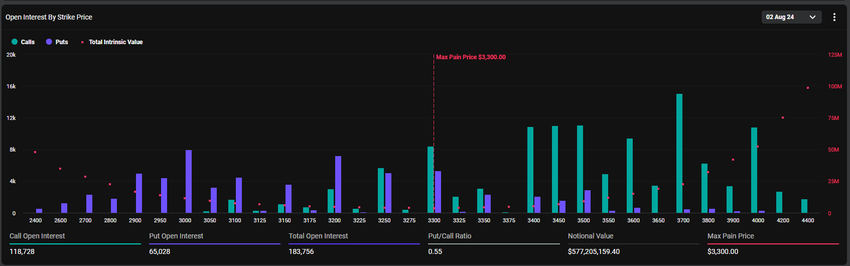 さらにイーサリアムでは、想定元本5億7720万ドルの18万3756契約が満期を迎えている。これらの契約の最大ペインポイントは3,300ドルで、プット対コールの比率は0.55です。