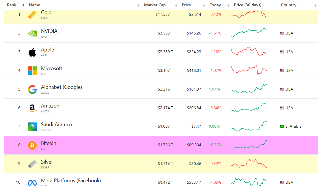 観測された取引活動は、ビットコインの最近の価格上昇によっても推進されており、それは8万8000ドルを突破した。この急騰により、市場資本化で銀を超え、ビットコインは1兆7360億ドルで世界第8位の資産となった。