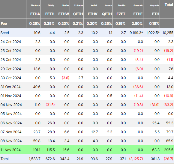 ビットコインETFの取引量が急増する中、イーサリアムETFも同時に流入記録を更新した。11月10日週には、米国のイーサリアムETFが合計で2億9500万ドルを超える流入を見た。これは過去最高である。