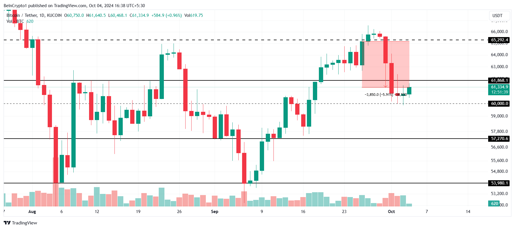 ビットコインの価格は先週約6%下落し、週末がさらなる下落を防ぎました。現在、BTCは61334ドルで取引されており、61868ドルをサポートレベルに転換しようとしています。この抵抗を突破することは、ビットコインが勢いを取り戻すために重要です。