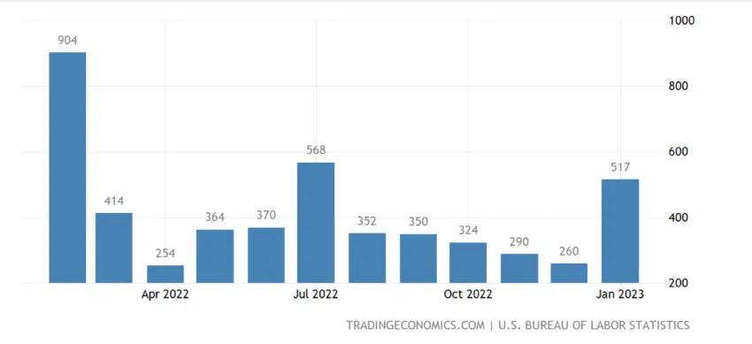 Sponsored Sponsored今年1月の米国雇用者数は、517,000人増加し、ダウ・ジョーンズの予想値187,000人を上回った。