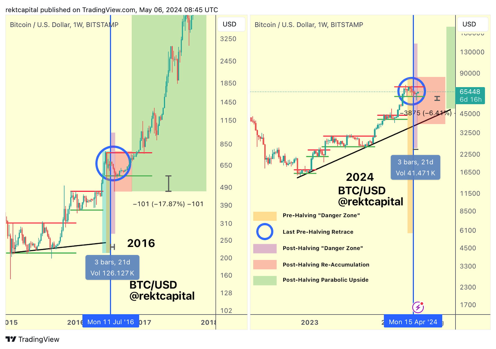 テクニカルアナリストのRekt Capitalは、「デンジャーゾーン」について、ビットコインがビットコイン半減期(2024年)とは?を迎えた後、3週間にわたって下値が乱高下する可能性があると説明している。