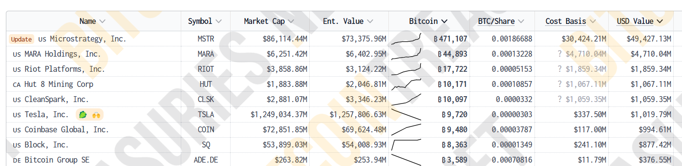ビットコイントレジャリーズによれば、テスラは9720BTCを保有しており、ビットコインを保有する上場企業の中で6番目に大きい。