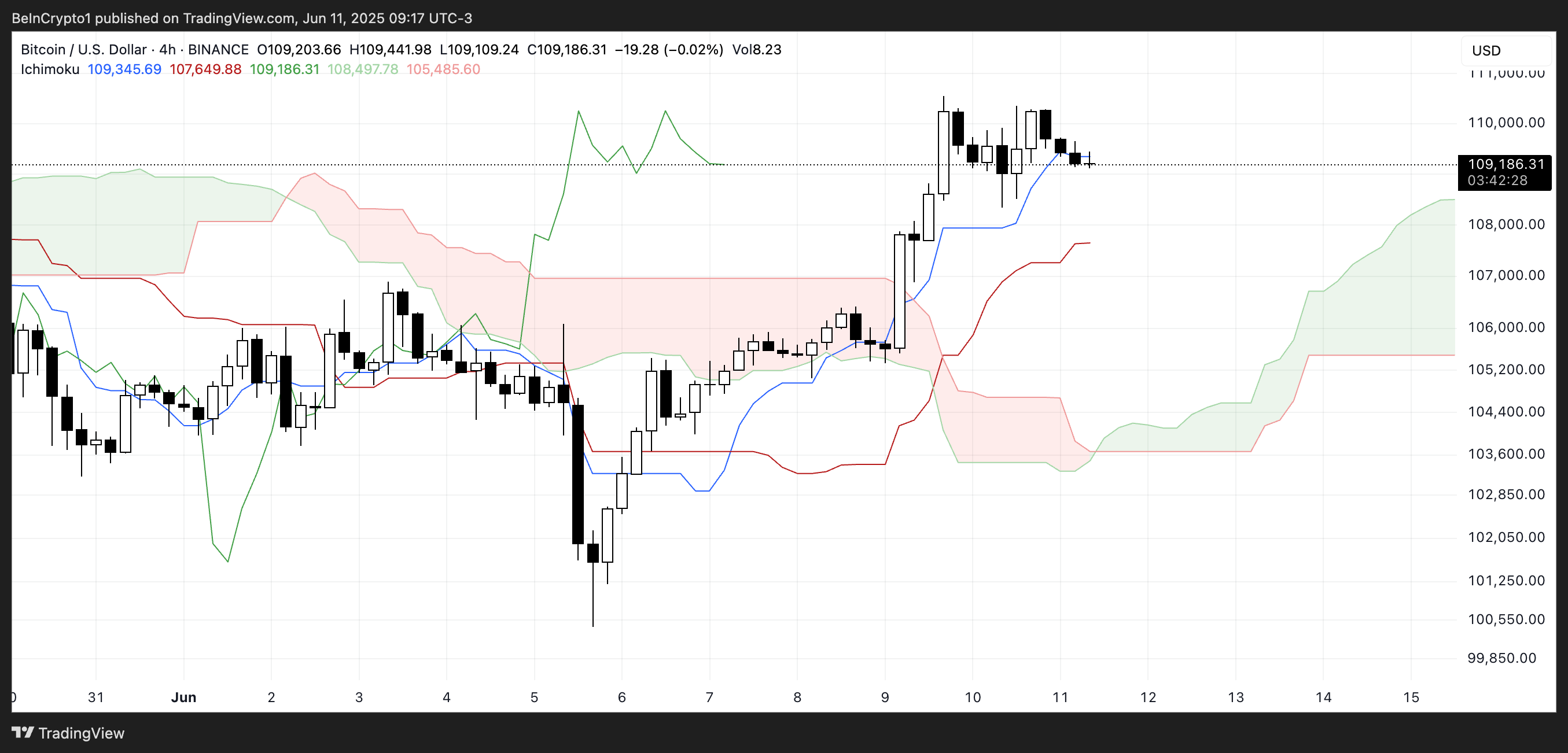 ビットコインの一目均衡表チャートは、価格が緑の雲の上にあることを示しており、強気な市場構造を反映している。