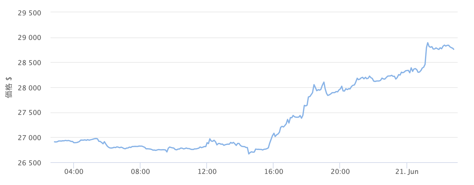 暗号資産(仮想通貨)ビットコイン(BTC)は20日夜から急反発し、21日未明、2万8000ドルを突破した。本稿執筆時点で2万8848ドルで取引されており、2万9000ドルも視野に入っている。過去24時間の上昇率は7.26%、ビットコイン・ドミナンスは51%に達した。
