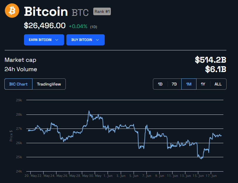 暗号資産取引所へのビットコイン大量流入は、マイナーによる売りを示唆している。6月に入りビットコインの価格は下落傾向にあったが、米ブラックロックによるビットコインETF申請を契機に反発した。ビットコイン価格は過去24時間に0.04%上昇し、本稿執筆時点で2万6496ドルとなっている。