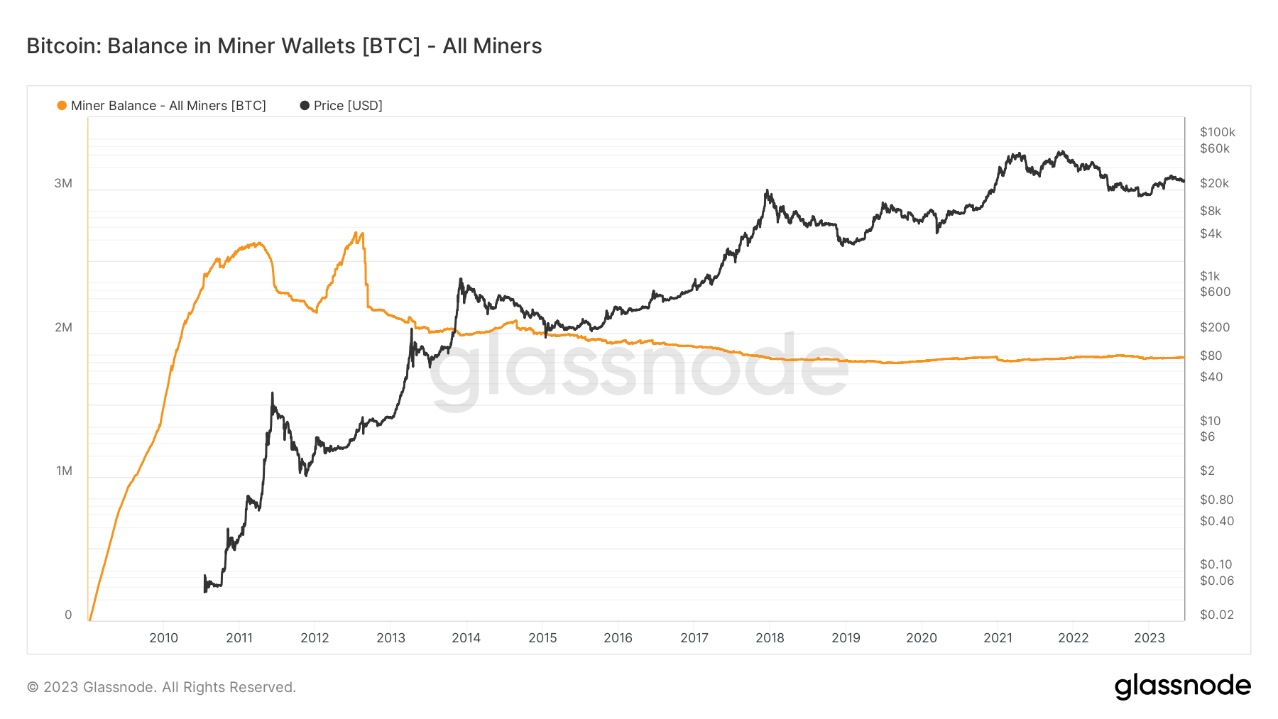 glassnodeによると、ビットコインマイナーのBTC保有枚数は全体で182万9000BTC(約490億ドル)。5月31日時点で183万6000BTC、6月2日時点で184万5000BTCと微増したが、米国証券取引委員会(SEC)によるバイナンス・コインベース提訴を受け、減少に転じた。