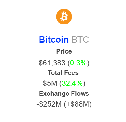IntoTheBlockのデータによると、ビットコインマイナーは過去1週間で取引手数料として500万ドルを稼ぎました。手数料の急増は、ネットワーク活動の活発化を示していますが、ビットコインの価格はボラティリティが低下しています。報告期間中、主要資産は主に6000万ドルから6300万ドルの範囲で取引されていました。