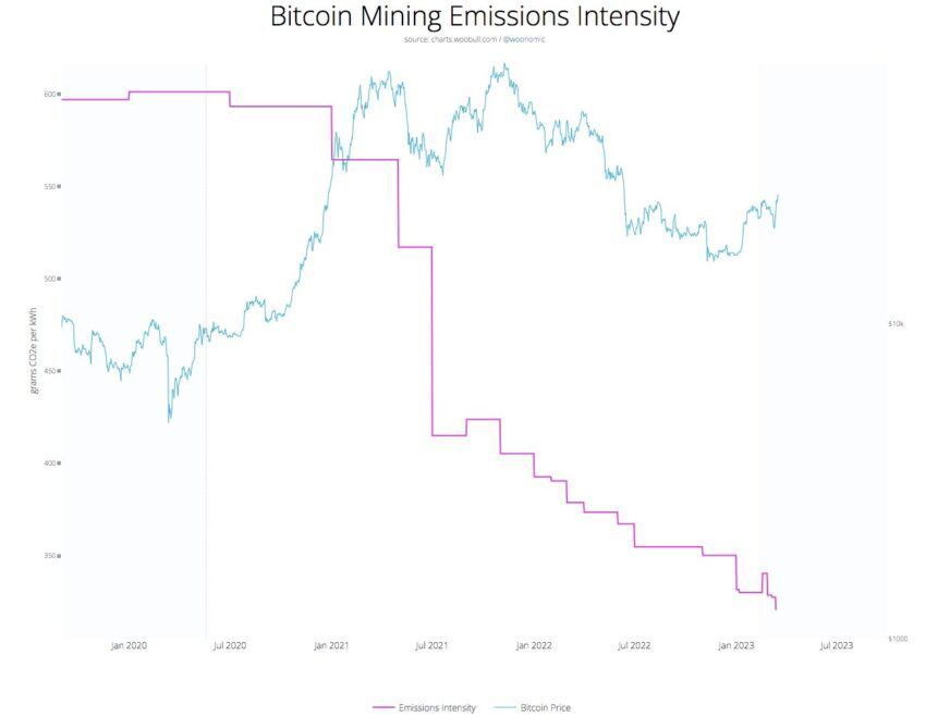 ビットコイン(BTC)のマイニングは、排出強度(Emissions Intensity)が下がるにつれてより持続可能となる。