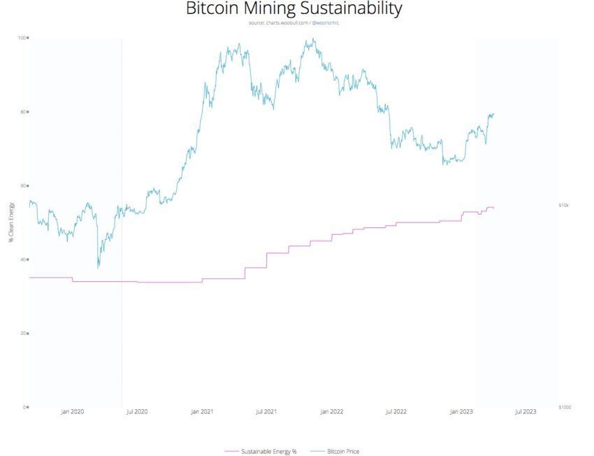 Sponsored結果、ネットワークの半分以上がクリーンエネルギーを使用し、ビットコイン・マイニングのサステナビリティはピーク時水準の54%付近を維持している。