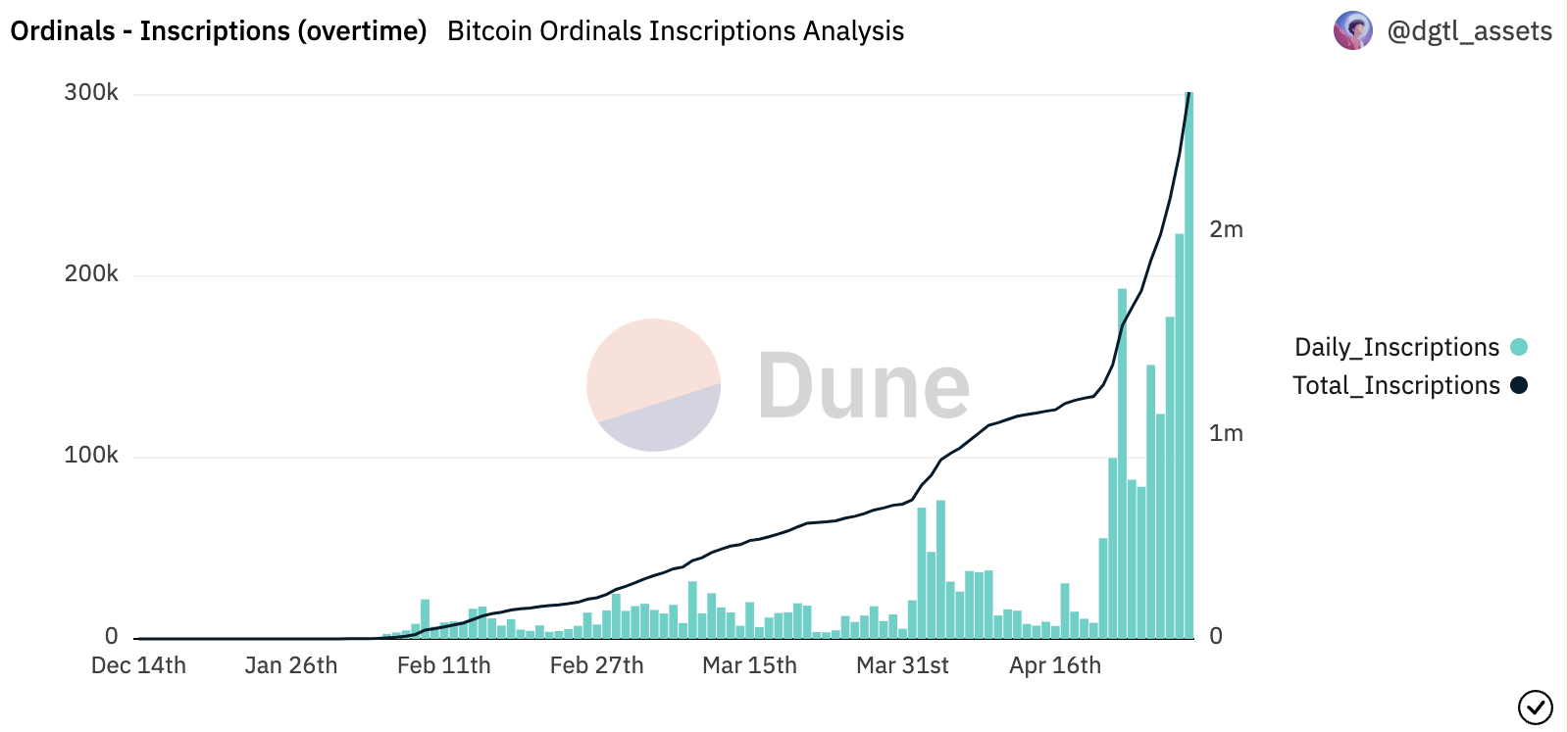 暗号資産分析ツールDuneによると、ビットコインNFTにおける1日あたりのインスクリプション件数は、4月だけで4回最高値を更新。30日、ビットコインNFTの累計インスクリプション数は250万件を突破した。