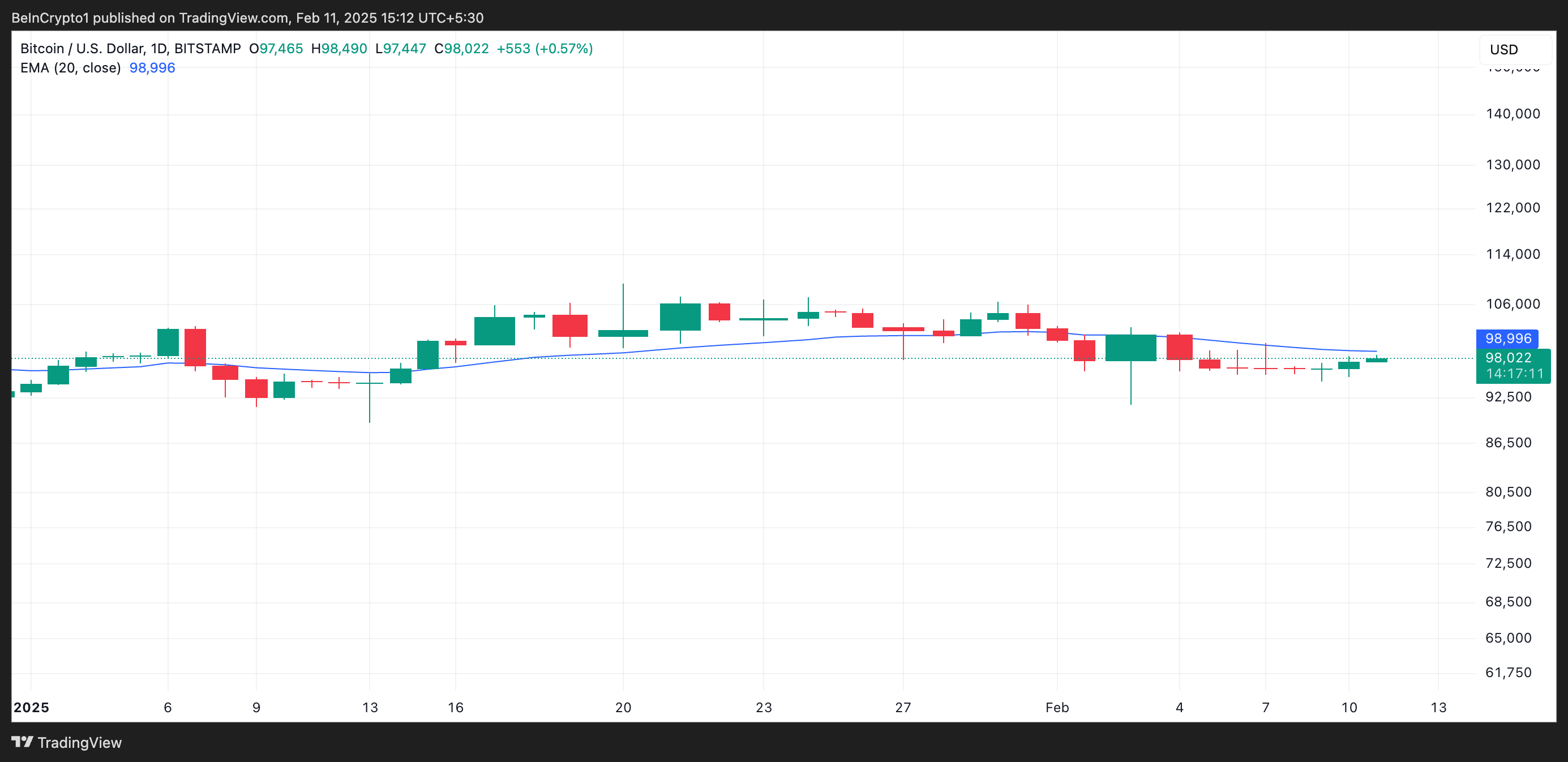 さらに、BTCが20日間指数移動平均線(EMA)を超えようとする試みは、キングコインの需要の復活を確認している。本稿執筆時点で、BTCは9万8022ドルで取引されており、この重要な移動平均線をわずかに下回っており、9万8995ドルで上に抵抗を形成している。
