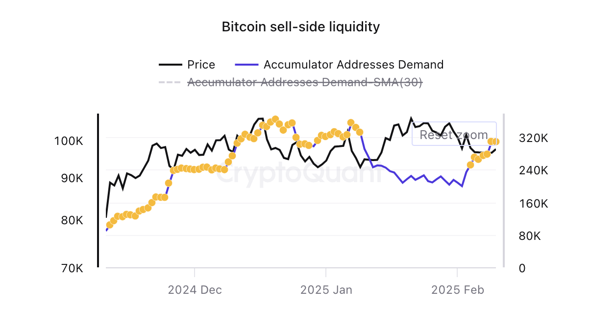 需要は2月初めのビットコインの調整にもかかわらず回復しており、長期保有者が主要資産に自信を持ち続けていることを示している。過去のサイクルと比較して、売却する長期保有者が少なく、上昇傾向の信念を強化している。