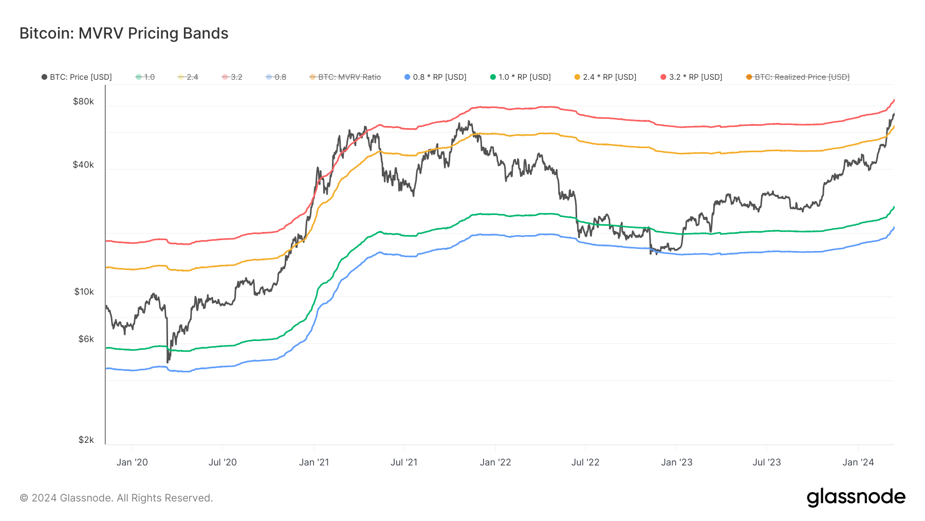 MVRV Pricing Bandsインジケータに基づき、価格の調整はビットコインを現在61,700ドル付近の2.4 MVRVレベルをテストするために押す可能性があります。