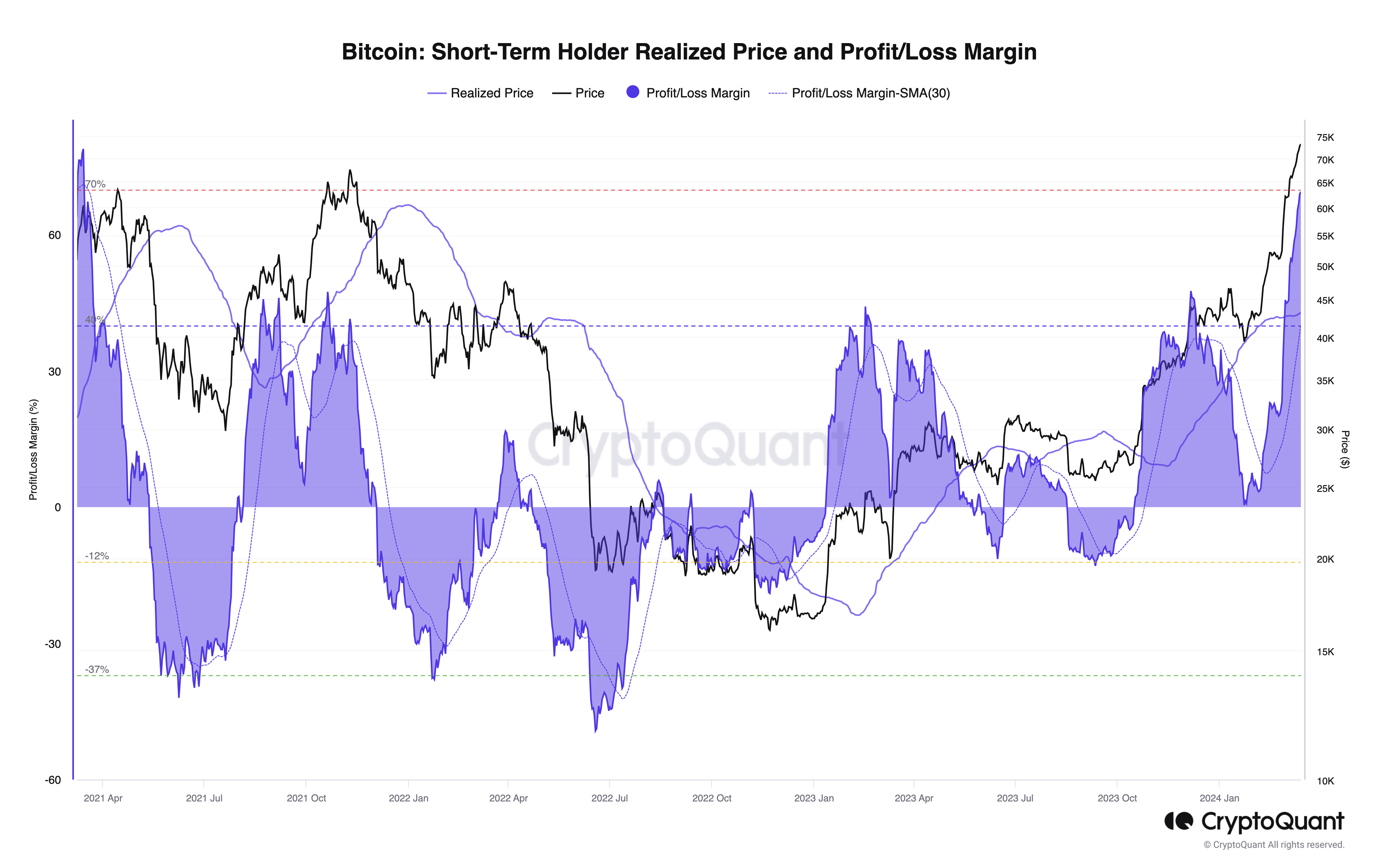 注目すべき指標である短期保有者の実現価格と損益マージン指標は、短期保有者が現在ビットコイン保有で70%の利益を抱えていることを明らかにしている。このレベルの未実現利益は過去3年間で前例がなく、潜在的な売り越しを示唆している。