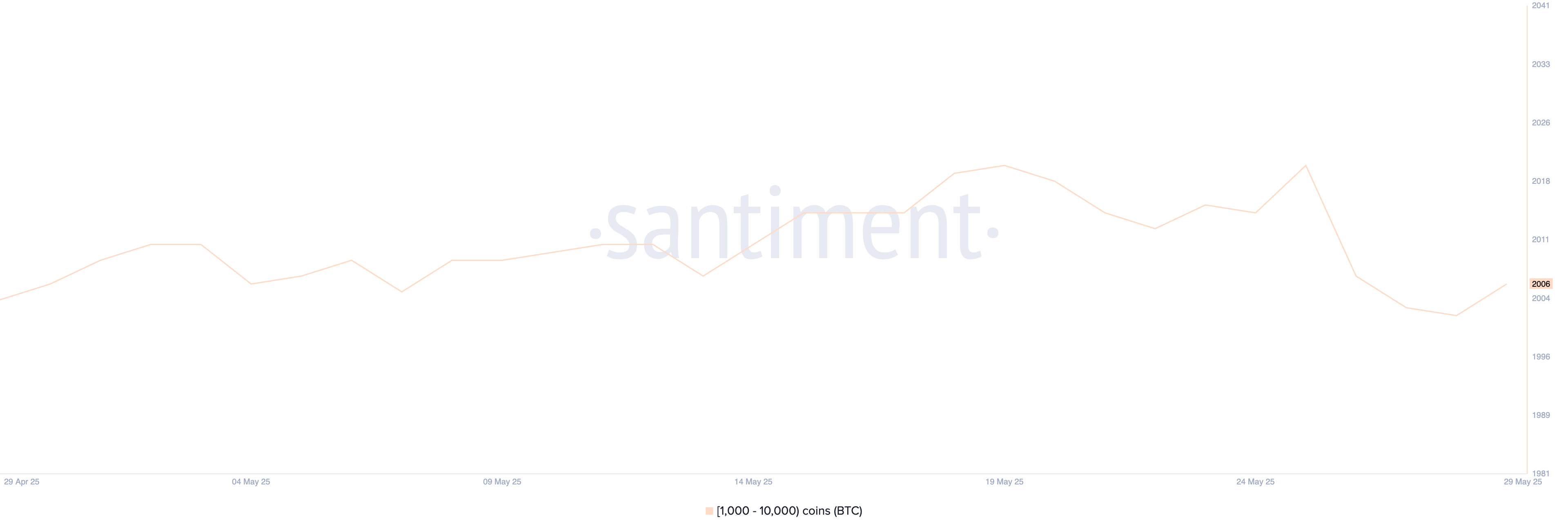 ビットコインのクジラ(1000から1万BTCを保有するアドレス)の数は、今週初めに2002に減少した後、2006にわずかに回復した。
