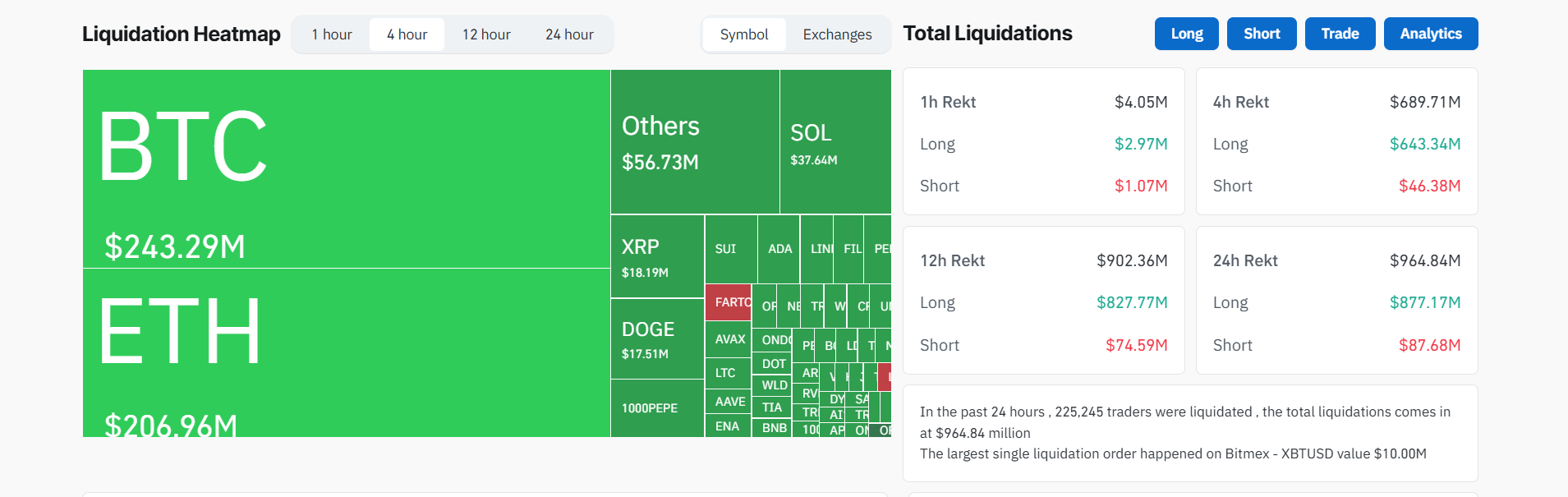清算データによると、過去24時間で合計9億6484万ドルのポジションが清算され、そのうち8億7717万ドルがロングポジションであった。