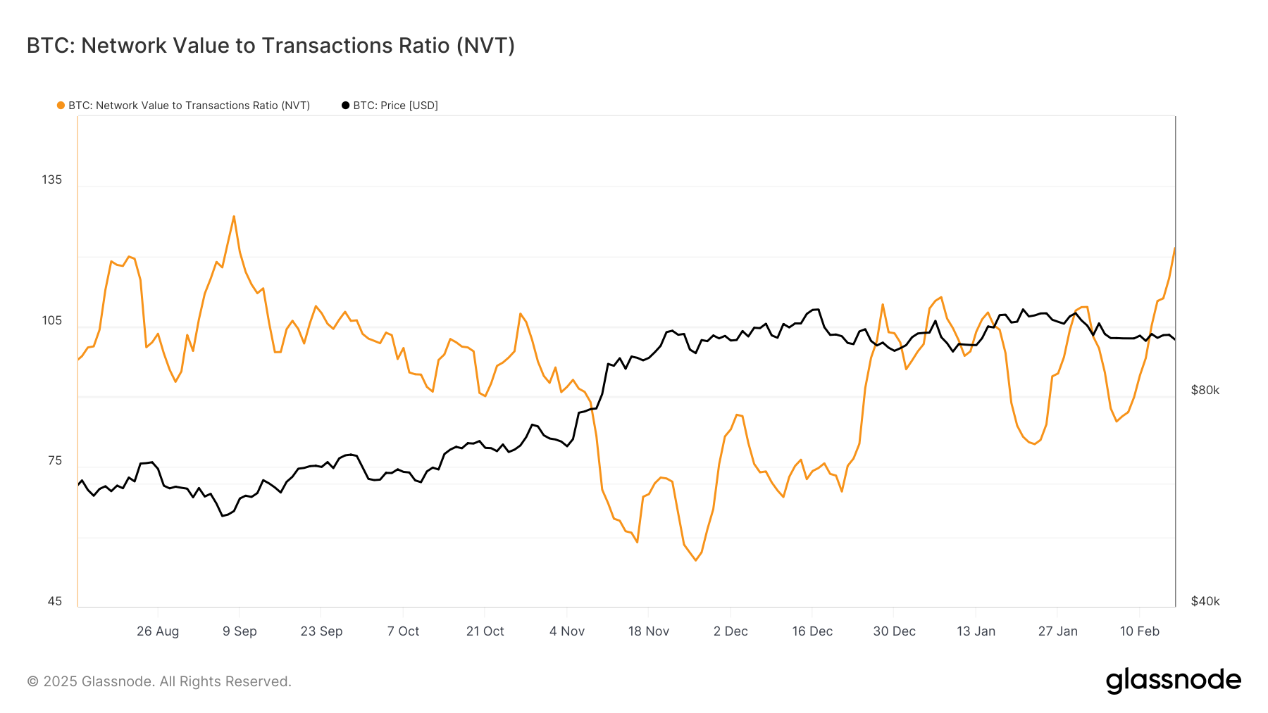 ネットワーク価値対取引量(NVT)比率は現在5か月ぶりの高水準で、2024年9月以来のレベルだ。NVT比率はビットコインのネットワーク価値と取引量の関係を測定し、ネットワーク価値が実際の取引を大きく上回っていることを示している。この不均衡は通常、ビットコインが過大評価されていることを示し、歴史的に価格修正の引き金となる。
