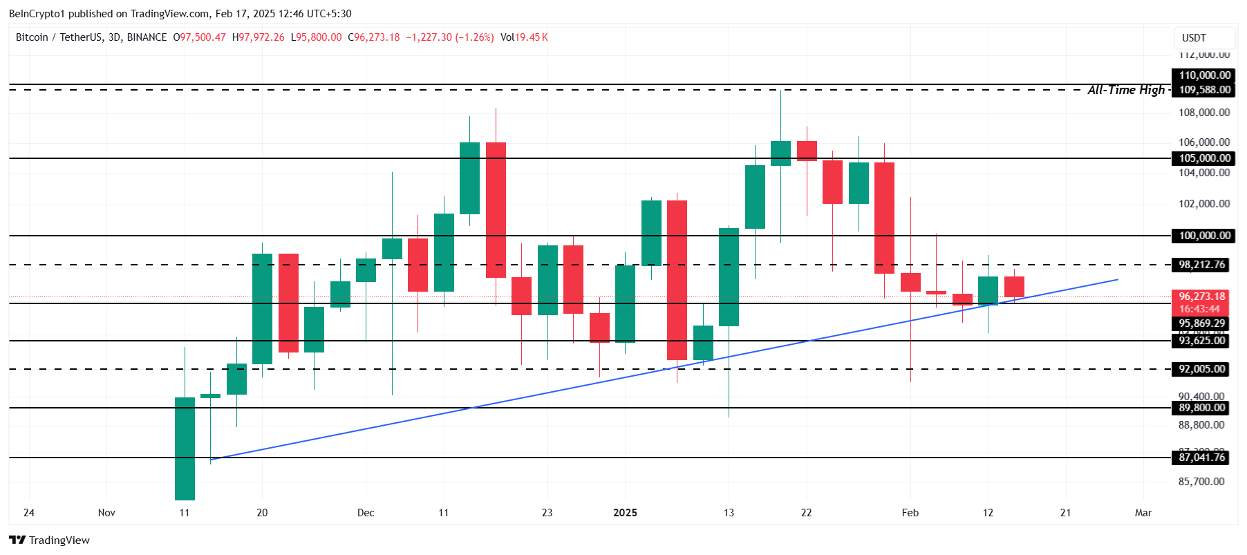 ビットコインは現在96273ドルで取引されており、重要なサポートレベルの9万5869ドルを上回っている。現在、ビットコインはさらなる価格下落を防ぐバッファーを提供している上昇トレンドのサポートラインを上回っている。これらのレベルが維持されれば、ビットコインは安定を保ち、重要なサポートを下回ることを避けることができる。