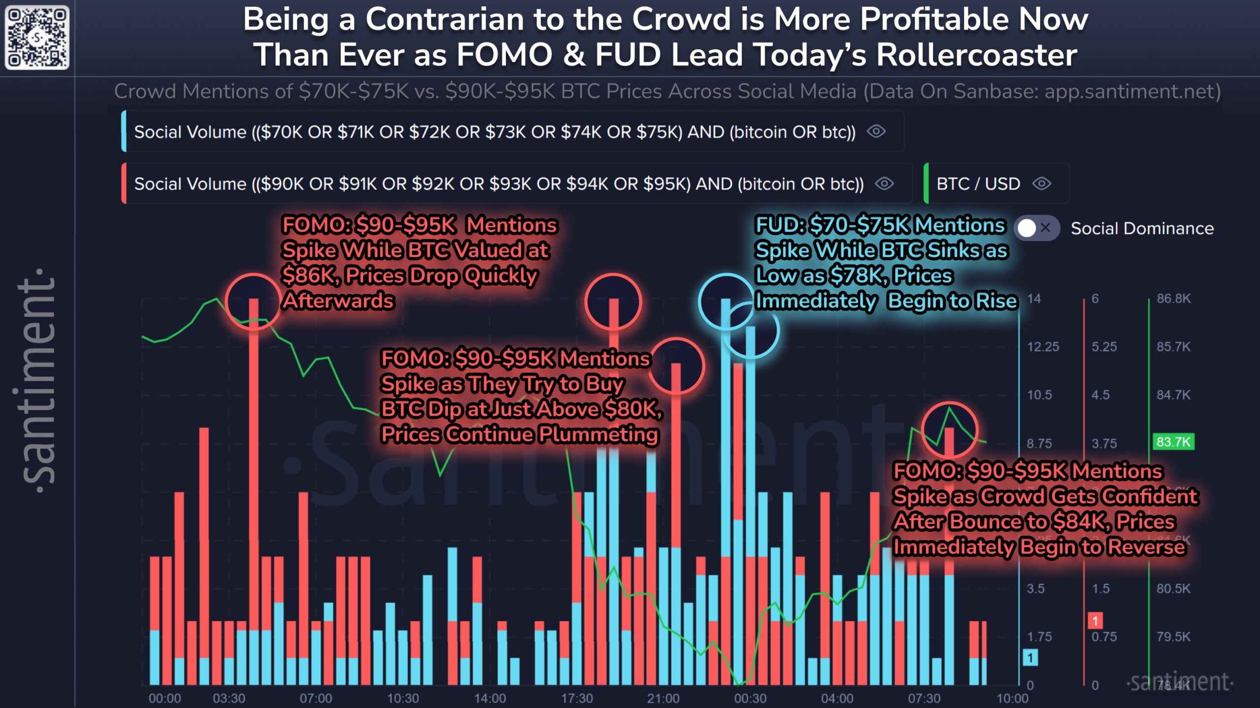 Santimentのデータは繰り返される傾向を示している。トレーダーはしばしばビットコインの価格動向を誤判断する。トレーダーが上昇を期待すると、市場は下落する傾向がある。逆に、下落を予想すると、ビットコインはしばしば上昇トレンドで驚かせる。このパターンは市場の予測不可能性が高いことを示唆しており、感情に基づく取引はリスクが高い。