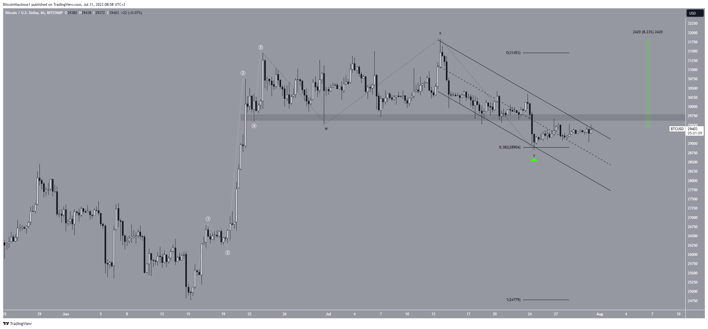 エリオット波動に基づき波動カウントを分析すると、6月14日以降、ビットコイン価格は上昇局面で推進5波を描いている。この波動カウントが正確なものであるならば、その後ビットコインはダブルスリー(W-X-Y)の調整パターンを経験したことになる。
