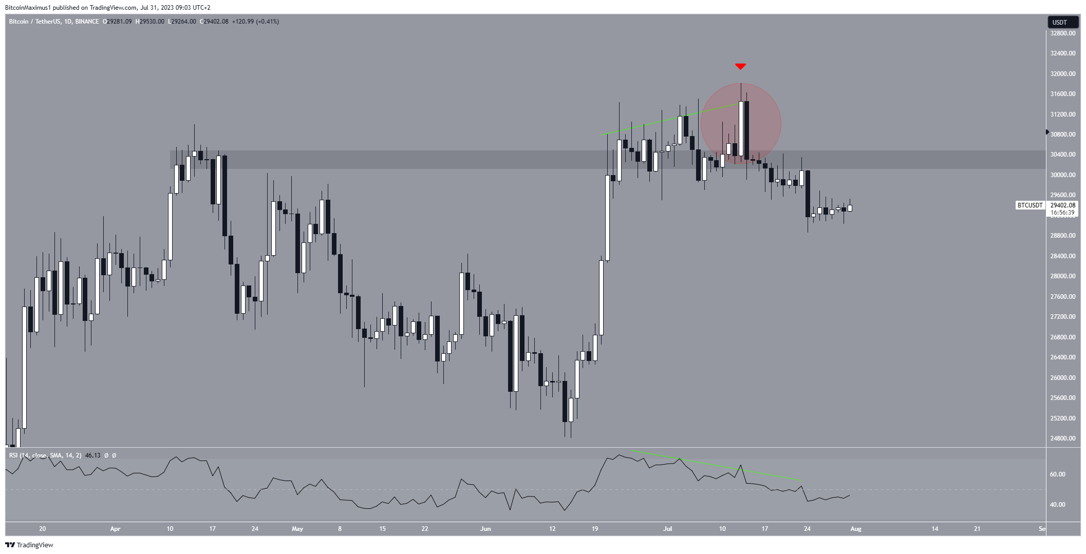 ビットコイン価格はその後、しばらく3万ドルの抵抗線上にとどまった。しかしながら23日、3万ドルを割り込んだ。このブレイクダウンは、3万ドルをブレイクアウトした直近の動きを乖離とみなすもので、弱気の動きの後に急落することが多い。