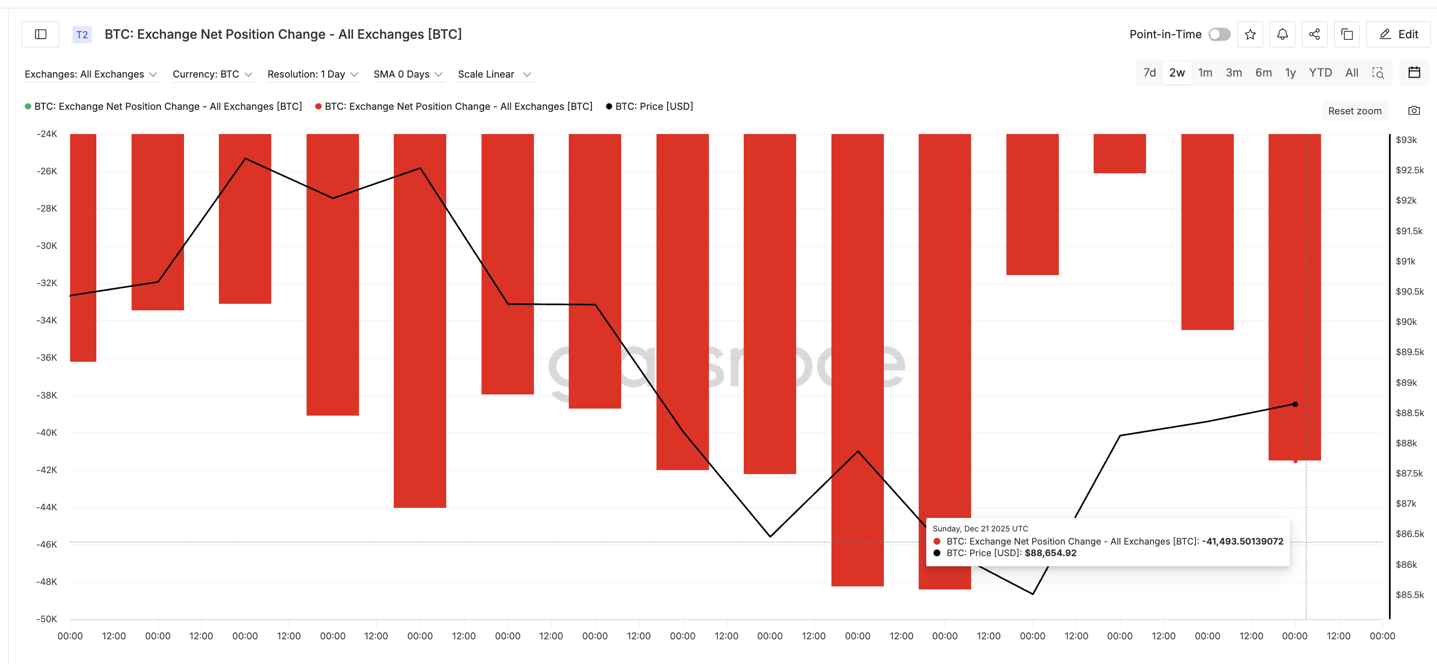 12月19日にはビットコインの取引所流出が約2万6,098BTCに達した。12月21日には41,493BTCまで急増。わずか2日間で流出が59%増えた計算となる。