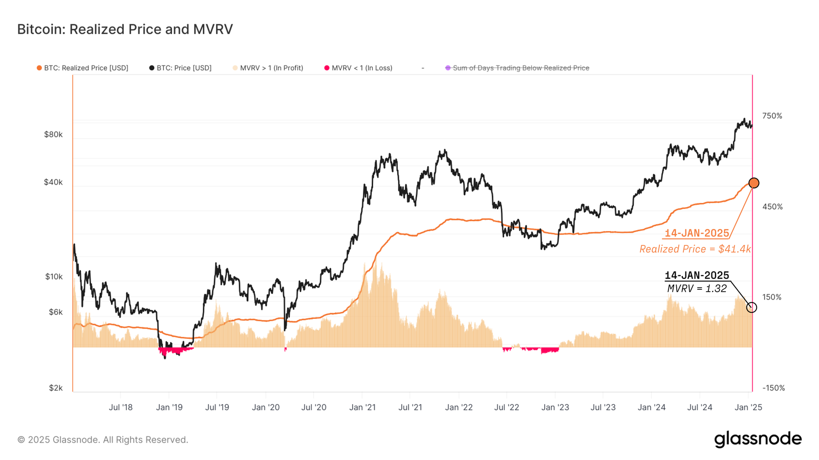 MVRV比率は現在1.32で、ビットコインの市場センチメントの良好さを反映しています。この指標は、ビットコインの現物価格と実現価格を比較し、平均的なBTCユニットが32%の未実現利益を持っていることを示しています。これは2024年4月中旬の過去最高値後の行動を思い起こさせ、最近の修正にもかかわらず上昇傾向を示しています。