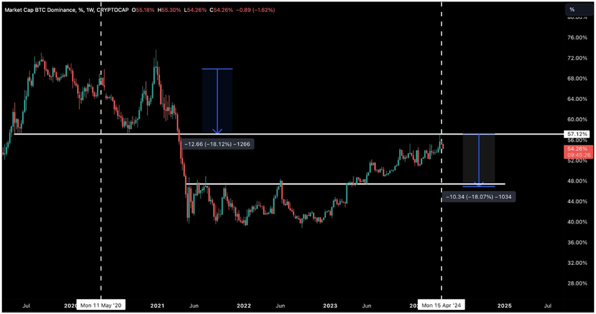 “BTC.Dの57%レベルは、過去のデータに基づく重要な技術的・心理的ベンチマークを意味する。ビットコインの優位性がこのレベルに達すると、ビットコインからアルトコインへの市場センチメントと資本フローのシフトを示す急激な拒絶が発生する傾向がある。先週の半減期後、BTC.Dは57%に達し、その後急落した」とBitfinexのアナリストは書いている。
