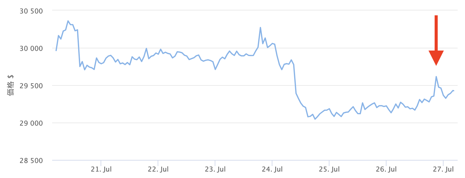 ビットコインは27日朝、2万9655ドルに達した後、現在は前日比0.6%増の2万9430ドルで落ち着いている。しかしながら、14日に記録した年初来高値の3万1800ドルと比較し、下落したままとなっている。