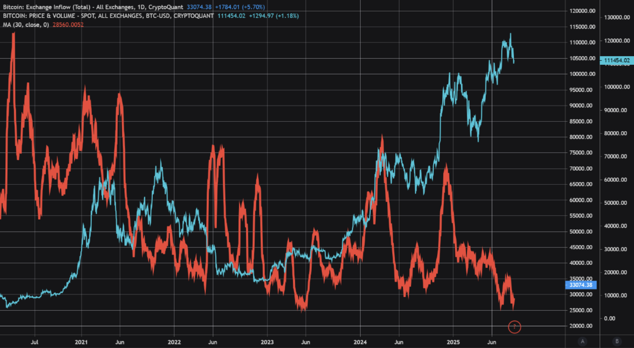 ビットコイン(BTC)の価格が再び上昇している。火曜日に10万8600ドルまで下落したが、すぐに11万2000ドルを超えて一時的に反発した。売り圧力が一時的に増加し、取引所への流入が急増したが、現在は再び減少している。