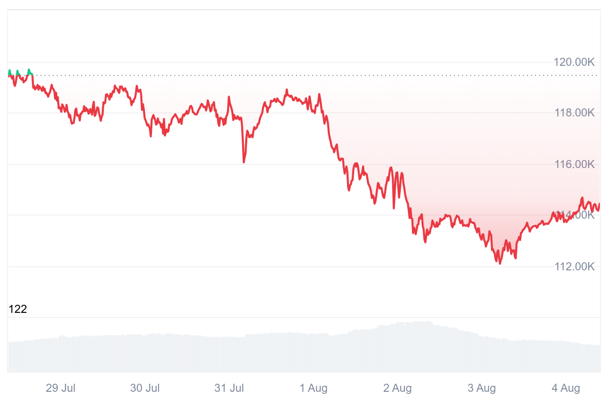 8月の暗号資産市場は厳しいスタートを切った。先週、ビットコイン価格は急落し、7月11日以来の11万7000ドルから12万ドルの範囲を下回った。ビットコインは週足で約4%下落し、一部のアルトコインは15%以上の下落を見せた。