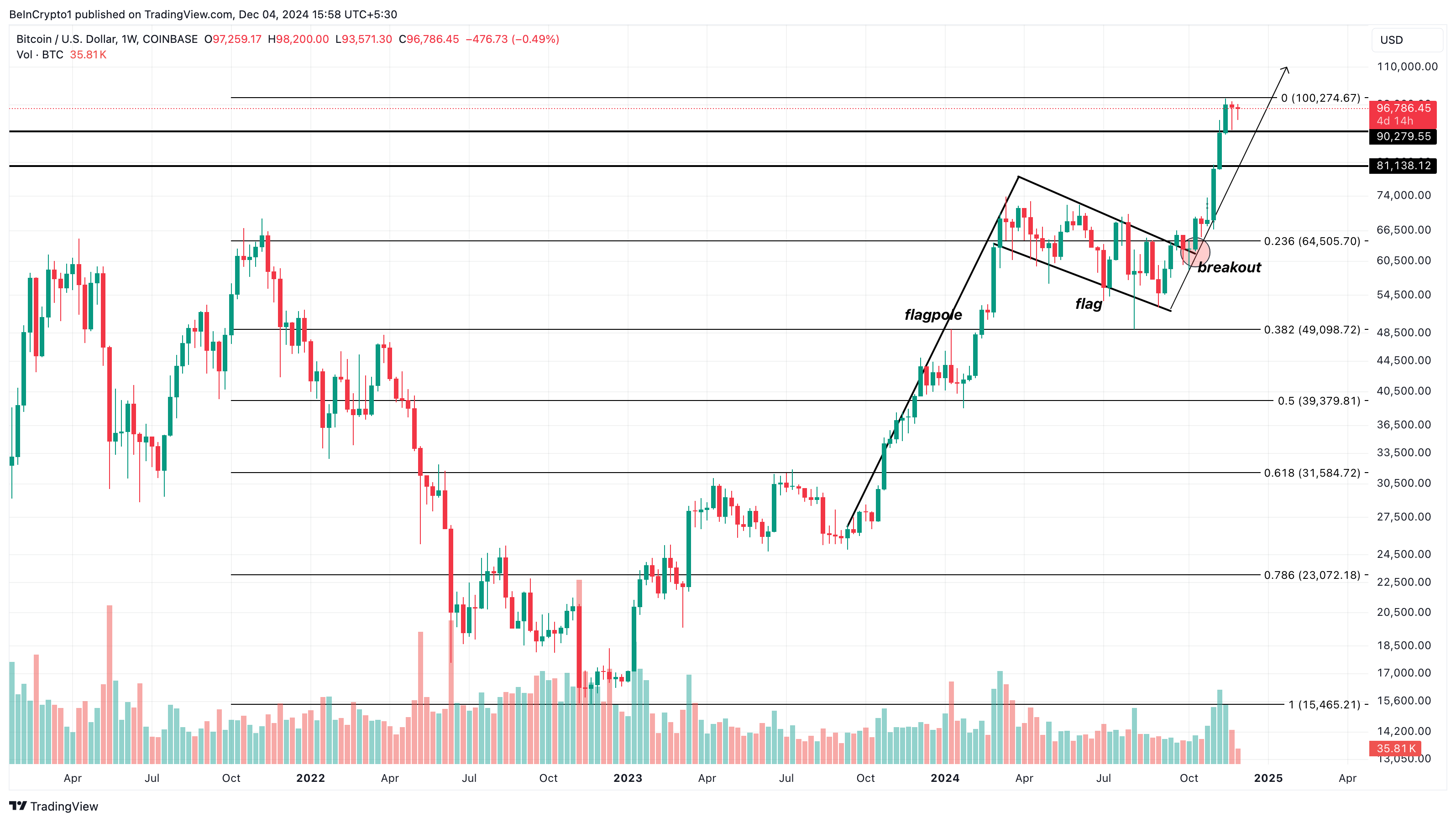 週足チャートでは、ビットコインがブルフラッグを形成している。ブルフラッグは、2つの強いラリーと短期間の統合フェーズで特徴付けられる上昇傾向のチャートパターンである。
