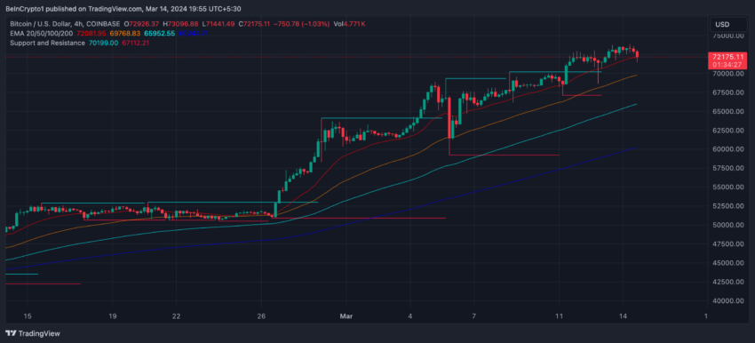 ビットコインの4時間足価格チャートでは、すべてのEMA(指数移動平均)ラインが価格ラインの下に位置し、これは一般に強気の傾向を示す。さらに、長期EMAが短期EMAよりも低い位置にあることも、強気のサインとされる。