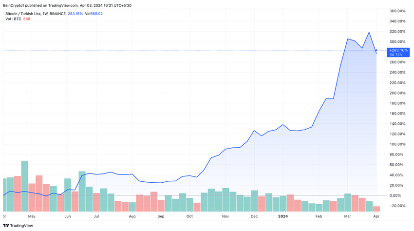 トルコリラは昨年、対ドルで40%近く下落し、通貨の脆弱性を浮き彫りにした。逆にビットコインはトルコで大幅な上昇を経験し、2023年6月以降ピーク値に達している。