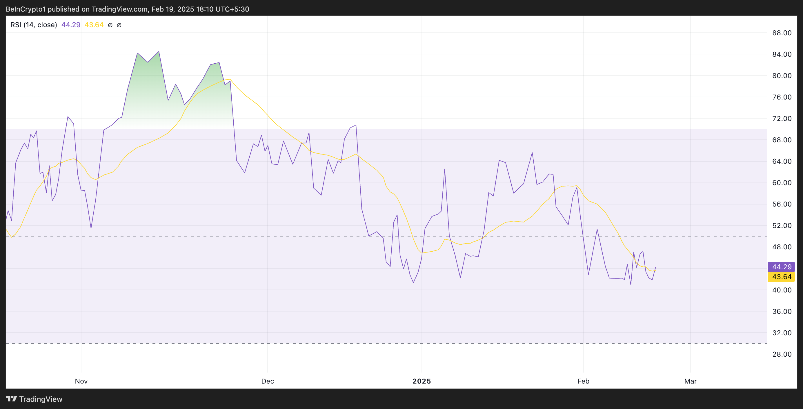 44.29のBTCのRSIは、売り圧力が買いの勢いよりも強いが、まだ売られ過ぎのレベルには達していないことを示している。これは、さらなる下落やトレンド転換前の潜在的な統合の余地があることを意味する。